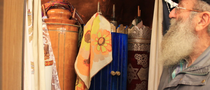 יעקב מסית את הפרוכת ופותח עבורינו את ארון הקודש בו שוכנים ספרי תורה בתוך תיקי עץ, מקושטים בבדים ומטפחות.